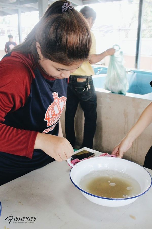 นักศึกษาสาขาประมง ฝึกปฏิบัติการเพาะพันธุ์ปลาตะเพียนขาวโดยวิธีการผสมเทียม ในรายวิชา ปฏิบัติการเพาะเลี้ยงสัตว์น้ำ