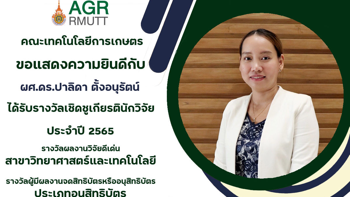 23 มกราคม 2023คณะเทคโนโลยีการเกษตร ขอแสดงความยินดีกับ ผศ.ดร.ปาลิดา ตั้งอนุรัตน์ ได้รับรางวัลเชิดชูเกียรตินักวิจัย ประจำปี 2565 รางวัลผลงานวิจัยดีเด่น สาขาวิทยาศาสตร์และเทคโนโลยี และรางวัลผู้มีผลงานจดสิทธิบัตรหรืออนุสิทธิบัตร ประเภทอนุสิทธิบัตร