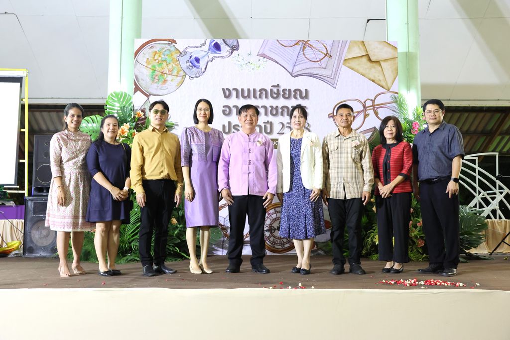 ผู้เกษียณอายุราชการ ร่วมถ่ายภาพกับผู้บริหารคณะเทคโนโลยีการเกษตรบนเวที