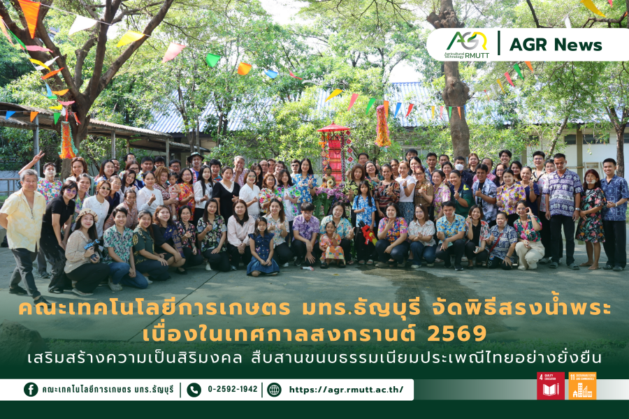 3 เมษายน 2026คณะเทคโนโลยีการเกษตร มทร.ธัญบุรี จัดพิธีสรงน้ำพระ เนื่องในเทศกาลสงกรานต์ 2569 เสริมสร้างความเป็นสิริมงคล สืบสานขนบธรรมเนียมประเพณีไทยอย่างยั่งยืน
