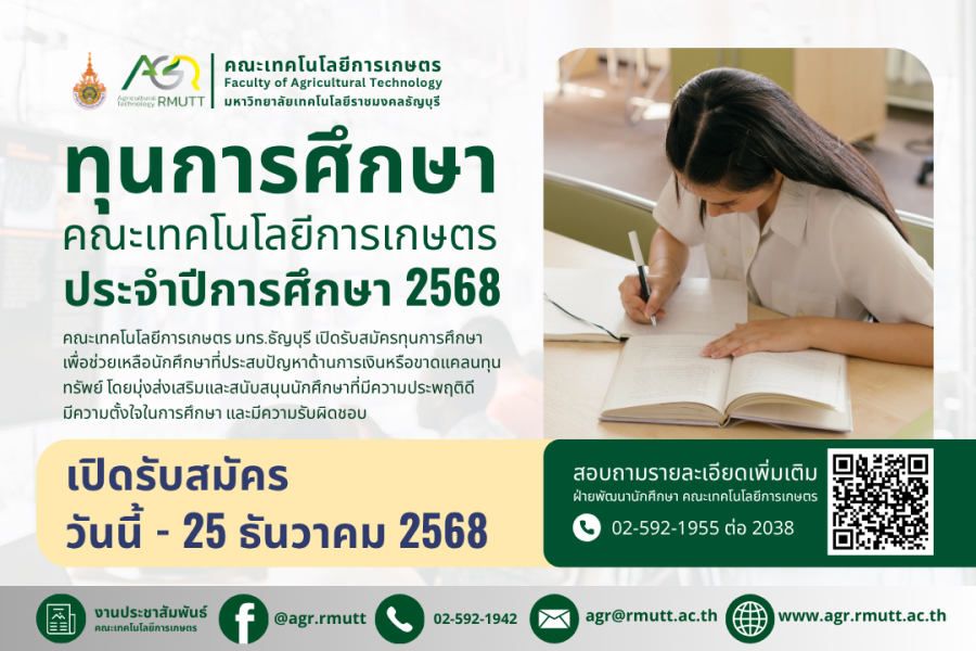 ประชาสัมพันธ์การสมัครขอรับ… อ่านเพิ่มเติม ประชาสัมพันธ์การสมัครขอรับทุนการศึกษาคณะเทคโนโลยีการเกษตร มทร.ธัญบุรี ปีการศึกษา 2568